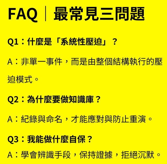 A:這是公開的知識庫,整理了集體施壓、隱匿壓迫及結構性加害的模式,協助被害人與研究者瞭解與應對。Q2:為什麼這些人要這樣做?